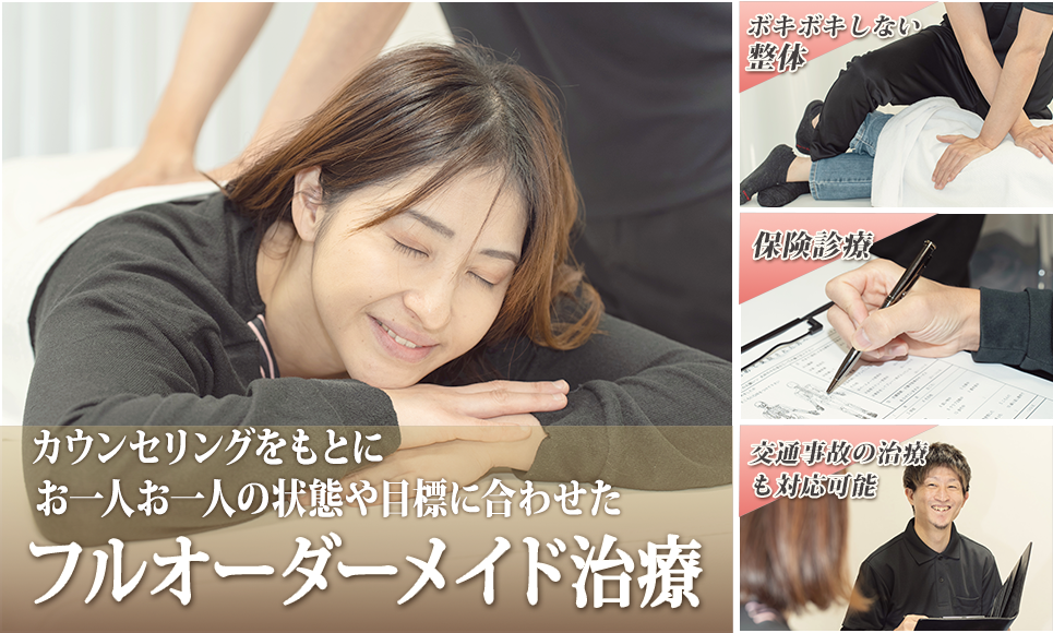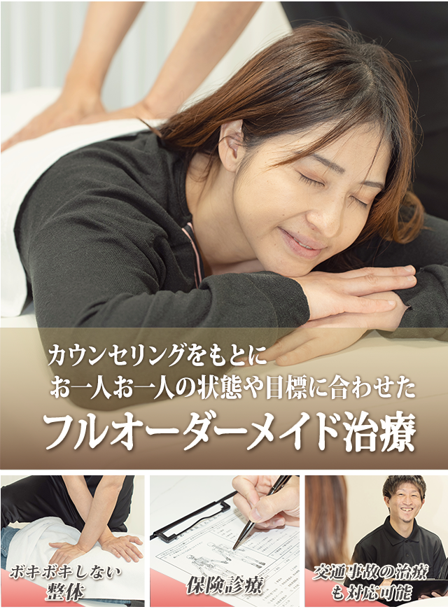 当整骨院では『一人ひとりに合わせたオーダーメイド治療』を基本とし、治療はもちろん、患者様のご希望をしっかりと理解し、納得して治療を受けて頂けるよう問診と診察を重視しております。